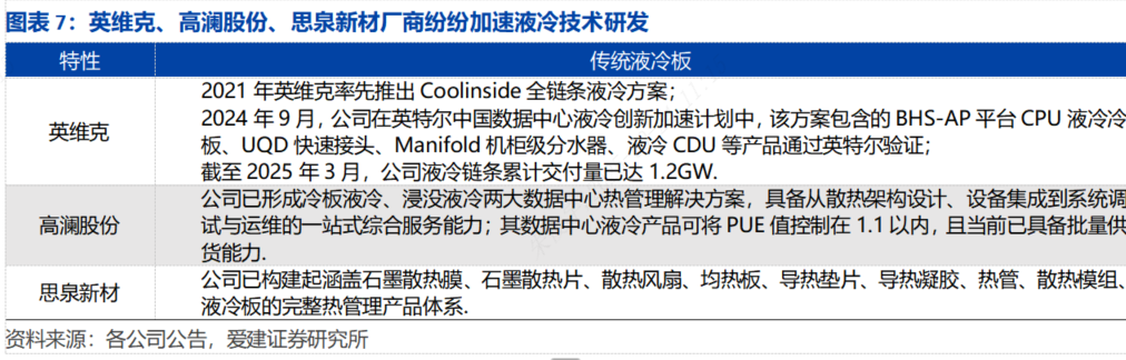 液冷行业趋势潜在受益企业:英维克、高澜股份、思泉新材。英维克是行业内少数具备全链条液冷解决方案的企业,2021年率先推出Coolinside全链条液冷方案,实现从冷板到冷源的“端到端”产品覆盖,2024年相关产品通过英特尔验证,截至2025年3月液冷链条累计交付1.2GW且零漏液;高澜股份作为国内专业热管理供应商,数据中心液冷领域有冷板、浸没式双方案及一站式服务能力,产品PUE≤1.1且已批量供货;思泉新材积极研发液冷技术,聚焦多行业,构建含液冷板的完整热管理产品体系,可提供定制化解决方案。