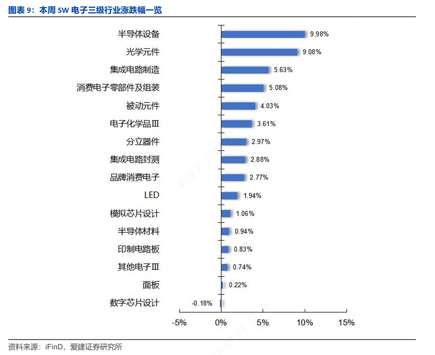 本周SW电子三级行业指数涨跌幅前三分别是:半导体设备(+9.98%),光学元件(+9.08%),集成电路制造(+5.63%);涨跌幅后三分别是:数字芯片设计(-0.18%),面板(+0.22%),其他电子Ⅲ(+0.74%)。