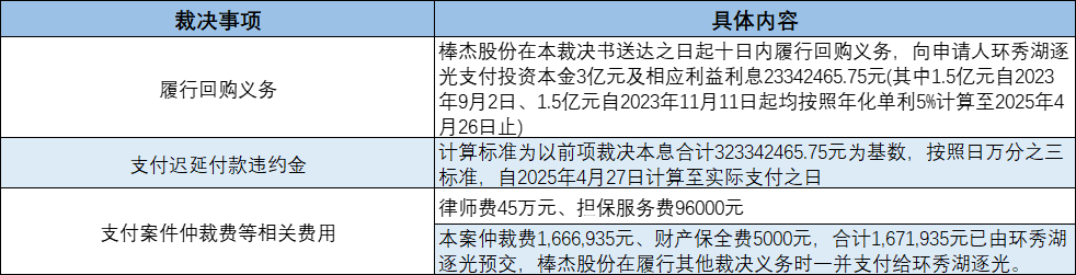 根据《裁决书》内容显示,棒杰股份在收到裁决书送达之日起10日内,该公司要履行回购义务,并向环秀湖逐光支付资本金3亿元及相应利息23,342,465.75元,支付迟延付款违约金,支付因提起本案仲裁而支付的律师费45万元、担保服务费96000元以及本案仲裁费1,666,935元、财产保全费5000元。