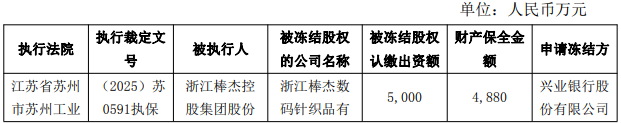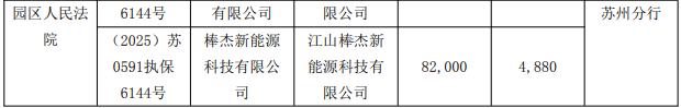 上述股权被司法轮候冻结的原因是,兴业银行股份有限公司苏州分行诉棒杰新能源、公司、扬州棒杰新能源科技有限公司金融借款合同纠纷一案[案号:(2025)苏0591民初10545号],申请江苏省苏州工业园区人民法院采取保全措施所致,案件涉及的财产保全金额为4,880万元。