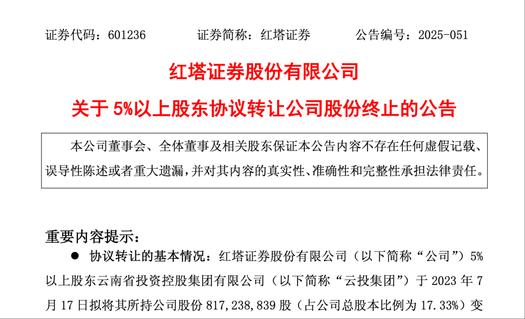 然而,计划赶不上变化。2025年9月23日,红塔证券收到云投集团《关于终止非公开协议股份转让事项的告知函》,云投集团与云投资本协商一致,决定解除此前签署的股份转让协议,并终止本次非公开协议股份转让交易及相关后续工作。值得注意的是,本次非公开协议转让的股份尚未经中国证监会审核,未办理过户手续,未发生实质转让。