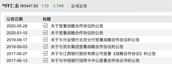 证券时报记者查询发现,近年来,*ST仁东的确先后多次发布签署战略合作协议的公告。具体合作对象包括中信银行信用卡中心、江西银行、京东集团、兴业银行北京分行等。