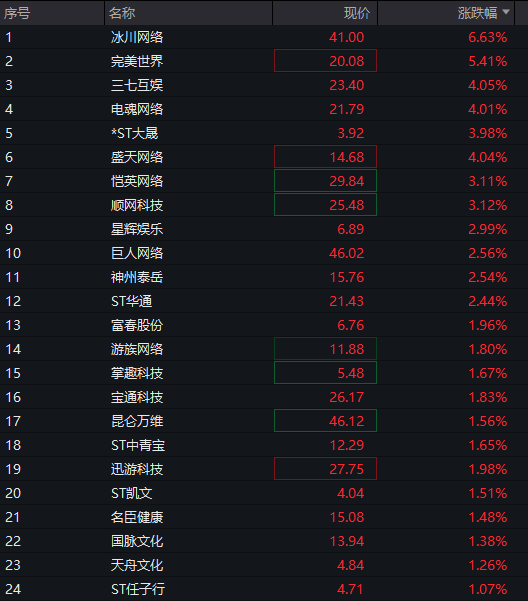 游戏概念股活跃,冰川网络涨超7%,电魂网络、完美世界、星辉娱乐跟涨。