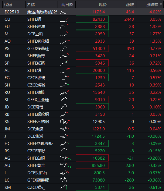 商品:国内商品期货多数上涨,截至发稿,沪铜、集运指数涨超2%,玻璃、豆粕、燃油、多晶硅等涨超1%,沥青、氧化铝、纸浆、烧碱、铝、鸡蛋、橡胶等小幅走高。工业硅、焦炭、热卷板、菜籽、沪银、铁矿石、沪金等下跌。