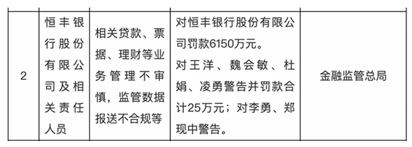 与银行一同受罚的还有6名相关责任人,其中,副行长郑现中被警告,王洋、魏会敏、杜娟、凌勇四人警告并罚款合计25万元。