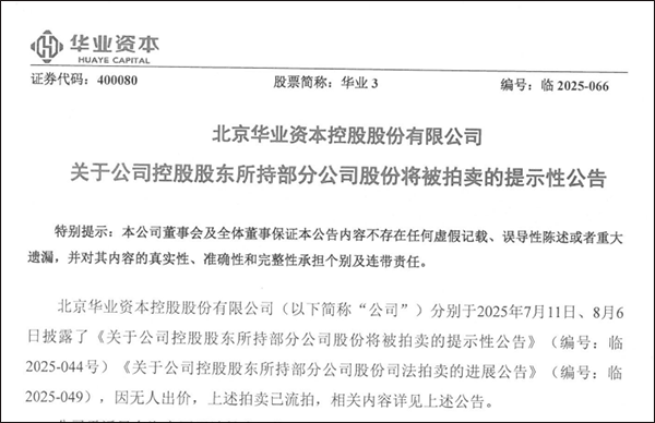公告显示,此次变卖标的为该公司下属深圳子公司所持有的“华业3”股票,共计1.316亿股。起拍价为926.52万元,保证金93万元,增价幅度为1万元及其整数倍。