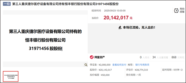 上证交易所网站消息,9月23日,北京华业资本控股股份有限公司(400080)发布进展公告称,其关联第三方重庆捷尔医疗设备有限公司(简称“重庆捷尔”)所持恒丰银行3197.1万股股份,近日在淘宝网司法拍卖平台完成公开竞拍,但因全程无人出价,本次拍卖最终流拍。