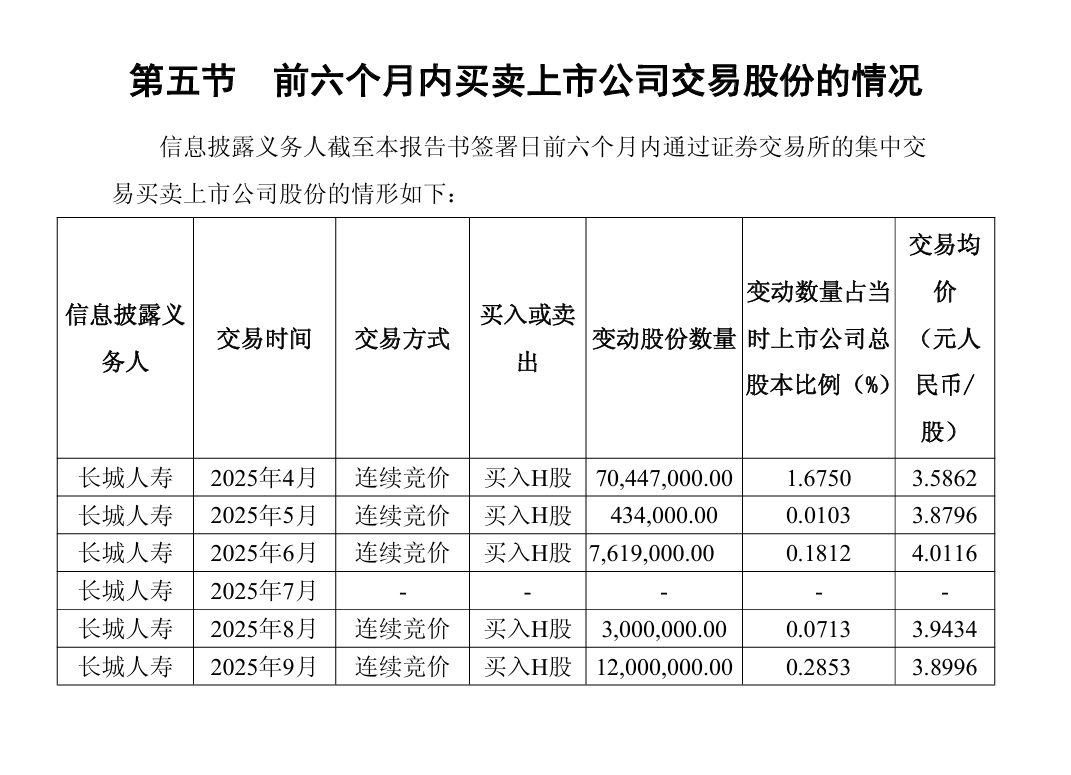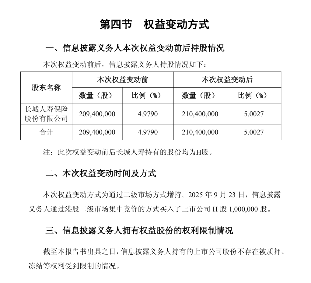 一家叫长城人寿的保险公司,在2025年9月23日通过港股市场买了新天绿能公司100万股H股,导致其总持股比例刚好超过了5%(从4.98%变为5.0027%),因此依法需要发布公告告知所有投资者。