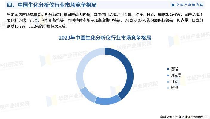 当前国内市场参与者可划分为进口与国产两大阵营,其中进口品牌以贝克曼、罗氏、日立、雅培等为代表,国产品牌主要包括迈瑞、迪瑞、科华和蓝怡等。同时整体市场呈现高度集中特征,迈瑞以40.4%的份额保持领先,贝克曼、日立分别以15.7%、11.2%的份额位居其后。
