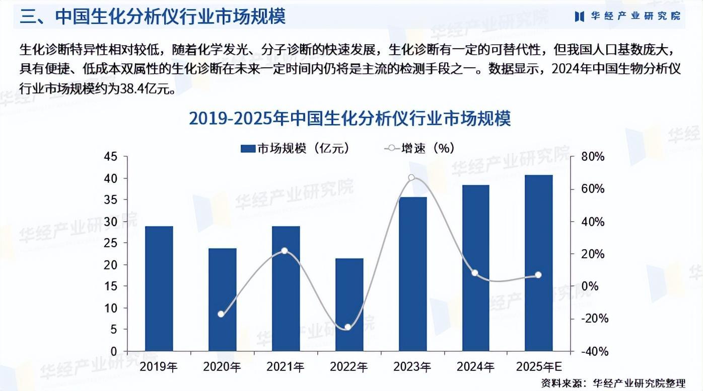生化诊断特异性相对较低,随着化学发光、分子诊断的快速发展,生化诊断有一定的可替代性,但我国人口基数庞大,具有便捷、低成本双属性的生化诊断在未来一定时间内仍将是主流的检测手段之一。数据显示,2024年中国生物分析仪行业市场规模约为38.4亿元。