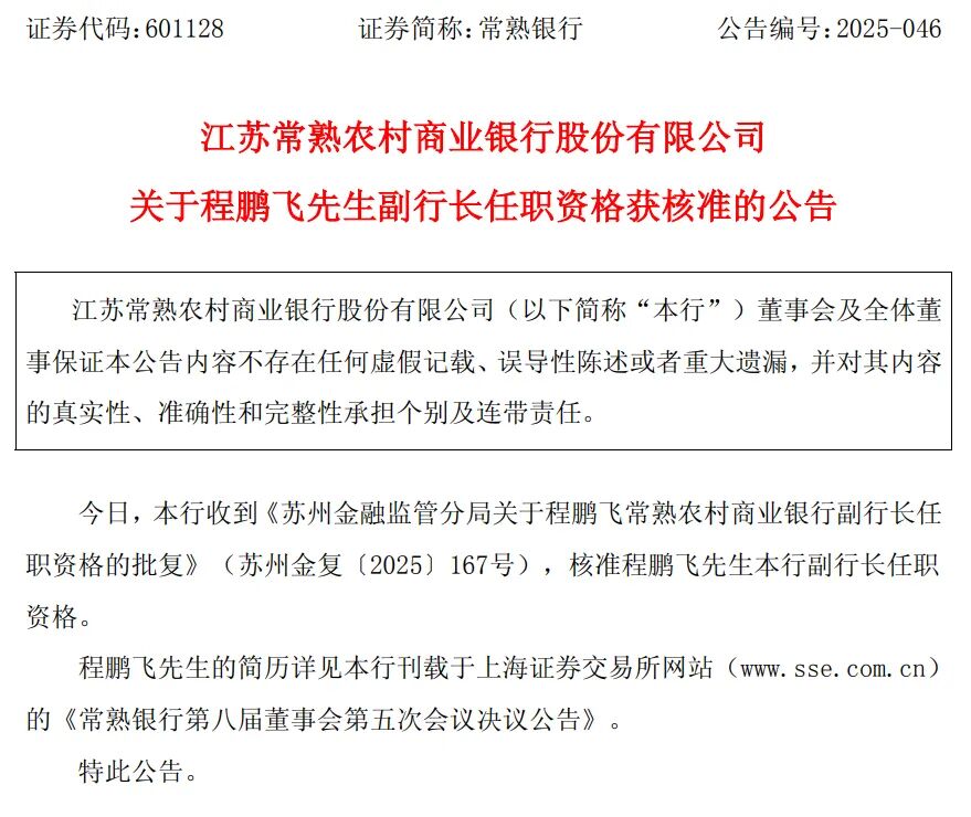 2025年9月24日,江苏常熟农村商业银行股份有限公司发布《关于程鹏飞先生副行长任职资格获核准的公告》。公告显示,该行于当日收到《苏州金融监管分局关于程鹏飞常熟农村商业银行副行长职资格的批复》(苏州金复〔2025〕167号),核准程鹏飞先生该行副行长任职资格。