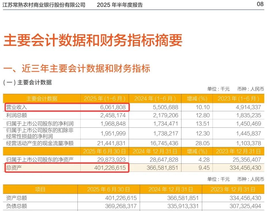 2025年中报显示,截至2025年6月末,常熟银行资产总额为4012.27亿元,较上年末增长9.45%。报告期内,该行实现营业收入60.62亿元,同比增长10.1%;实现归母净利润19.69亿元,同比增长13.51%。