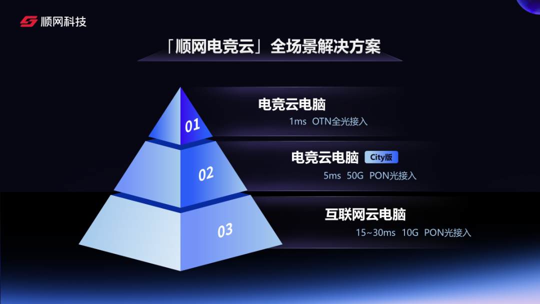 依托全光网络构建的毫秒级时延能力,借助 OTN 全光、50G PON、10G PON 等光接入技术,顺网科技打造 “顺网电竞云” 产品矩阵,通过针对 1ms/5ms/15ms 三个层级网络情况的分层设计,覆盖从 “专业电竞” 到 “大众娱乐” 全场景,将高性能算力转化为如同水电般随时可获取的基础资源 —— 这一 “数字水电” 的核心构想,正通过具体场景解决方案逐步落地。