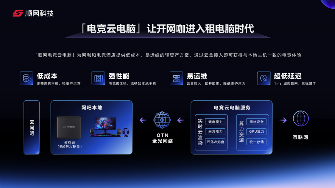 面向网咖、专业电竞酒店等对算力体验要求较高的场景,顺网科技推出电竞云电脑解决方案,以 “无需本地主机、实现轻资产运营” 为核心。通过与运营商深度合作部署边缘 GPU 资源池,结合全光网络低时延优势,搭配端到端优化,实现操作 “零感知延迟”,支持 240Hz 以上超高刷新率,体验与本地高配主机一致。
