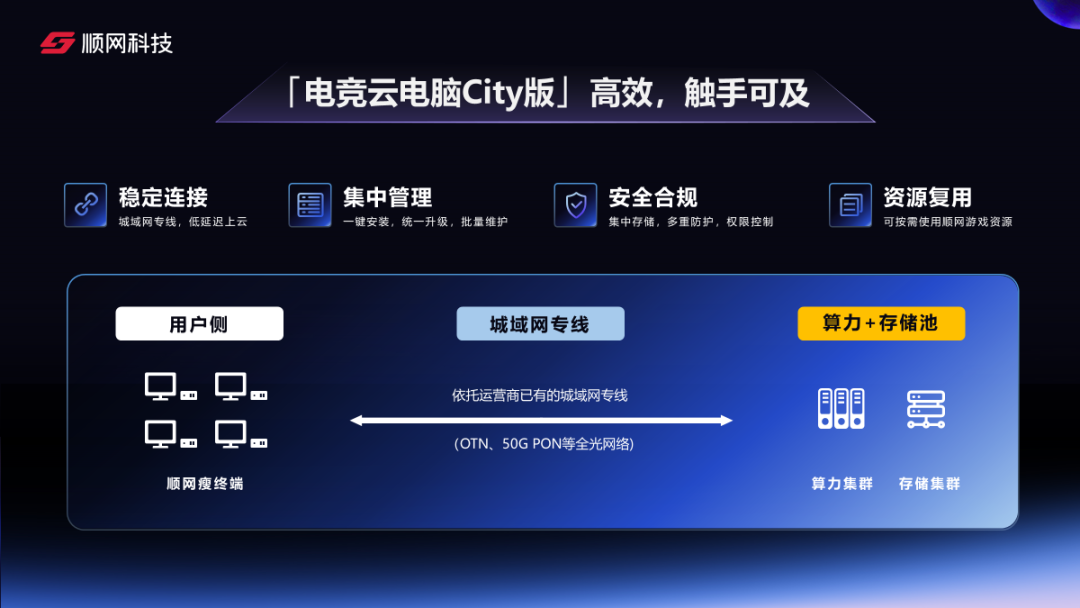 针对企业、学校等政企场景,以及家庭轻电竞需求,顺网电竞云电脑 City 版以全光网络为支撑,提供 144Hz 高刷新率与无损色彩显示,既能满足设计渲染、教学实训等生产力需求,也能适配轻电竞娱乐场景。其核心价值集中在 “高效管理” 与 “安全可靠” 两大维度:云端集中管控实现软件一键安装、统一升级,例如学校电教室更换教学软件时,管理员后台操作即可完成百台设备同步更新,管理效率大幅提升;数据集中存储于云端,搭配多重安全防护机制,有效防止信息泄露与病毒侵入,保障政企核心数据安全。