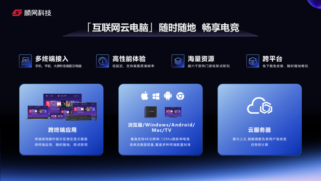 面向个人用户多元化需求,顺网电竞云推出 “互联网云电脑”,打造 “全场景算力使用平台”,主打 “随时可用、随地可享”。依托全光网络广泛覆盖能力,手机、平板、普通 PC 等终端只需联网登录,即可秒变 “高配游戏本” 或 “专业工作站”;更针对个人用户可能面临的弱网环境做了专项优化,即便网络延迟达到30ms,也能通过技术调校实现与 15ms 延迟同等的使用效果,保障操作流畅度与画面稳定性。