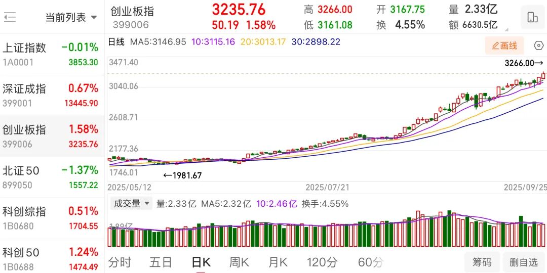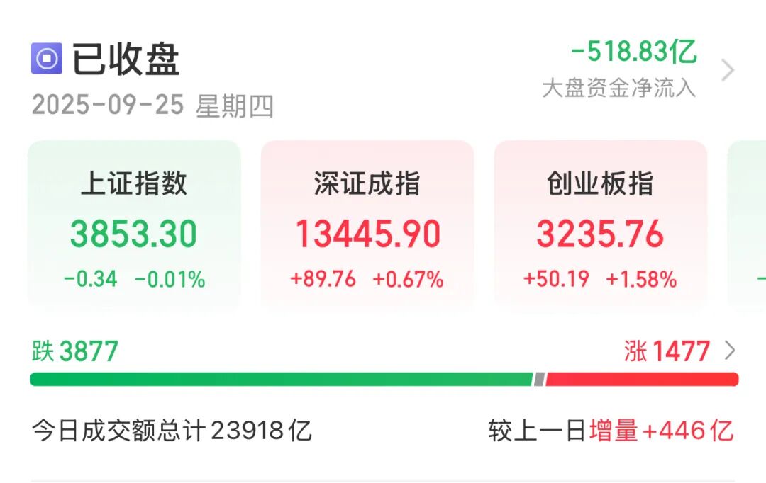 9月25日,A股三大指数涨跌不一。截至收盘,上证指数跌0.01%,深证成指涨0.67%,创业板指涨1.58%,北证50跌1.37%。
