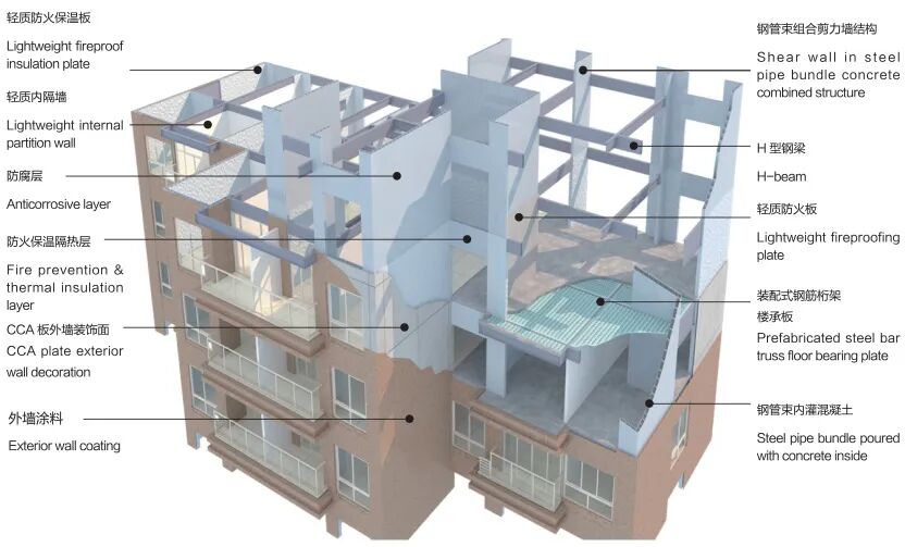 图片来源:浙江省住房和城乡建设厅官网“钢管混凝土束结构装配式建筑体系”是由钢管混凝土束剪力墙、H型钢梁、装配式钢筋桁架楼承板等作为建筑主体结构,辅以防腐层、轻质防火保温板、轻质隔墙、防火保温隔热层、CCA 板外墙装饰面板、外墙涂料等功能性、装饰材料组合形成的一整套具有革新性、高效能的装配式钢结构住宅建筑体系,可适应不同的建筑户型布置,该建筑体系实现了构件、部件的标准化设计、工业化生产、装配化施工,工程质量优,节能环保。