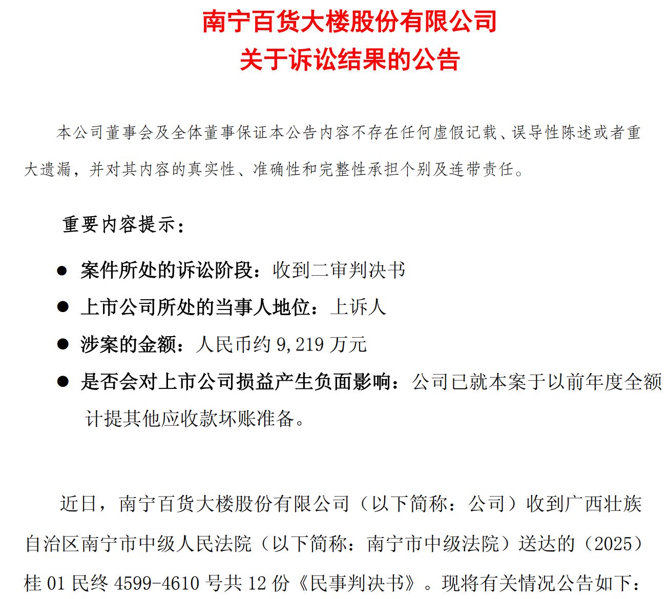 2024年12月,法院作出一审判决,驳回了南宁百货的诉讼请求。南宁百货不服,今年5月再次向南宁中院提起上诉,请求撤销一审法院作出的判决,改判支持公司的全部诉讼请求。
