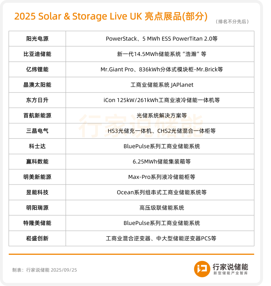 这不仅为英国储能市场注入了强心针,也清晰揭示了英国能源转型正进入实质性加速阶段。在9月23日-25日,英国一年一度的 Solar & Storage Live UK 2025 展会上,行家说储能观察到已有14家中国企业正在抢滩卡位。