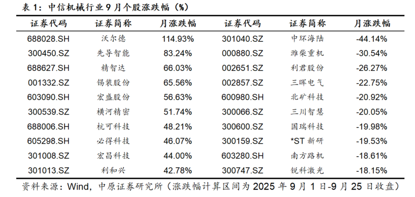 个股方面,截至2025年9月25日收盘,沪深两市9月中信机械板块632只个股,其中315只上涨,311只下跌,涨跌幅中位数为0%。