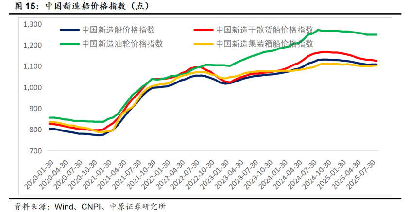 2025年8月底中国新造船价格指数为1107点,环比下跌1个点。其中,中国新造干散货船价格指数1125,中国新造油轮价格指数1249,中国新增集装箱船价格指数为1103,环比分别下跌4、0、-2个点。