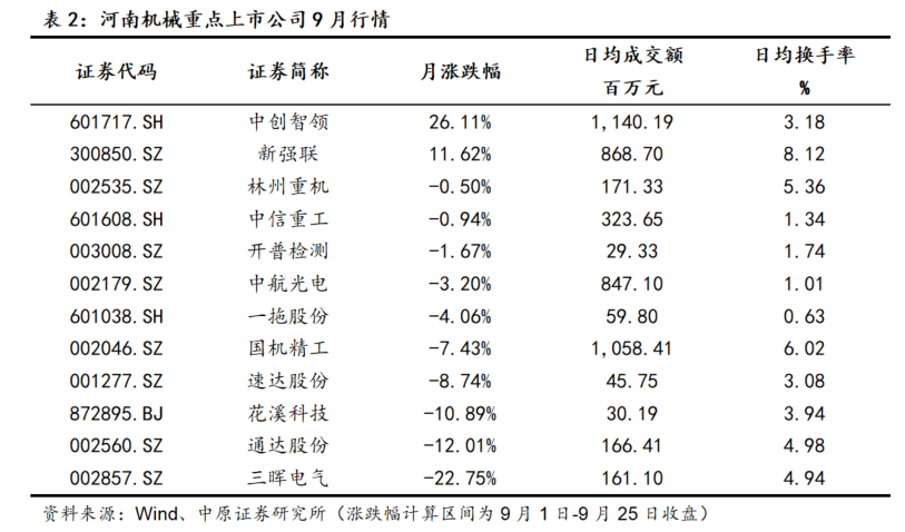 截至2025年9月25日收盘,沪深两市9月2家河南机械上市公司取得正涨幅,分别是中创智领(26.11%)、新强联(11.62%)。
