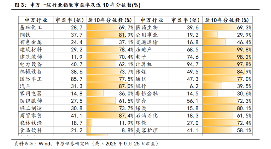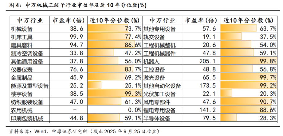 从申万一级行业指数市盈率及近10年分位数来看,截止2025年9月25日收盘,申万机械行业市盈率为38.6倍,位于近10年市盈率分位数的73.7%,处于行业估值均值水平以上。