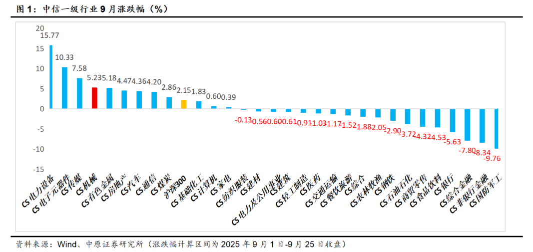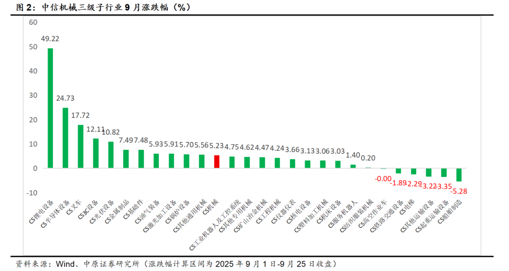 截至2025年9月25日收盘,9月中信机械板块上涨5.23%,跑赢沪深300指数(2.15%)3.08个百分点,在30个中信一级行业中排名第4名。9月三级子行业中锂电设备、半导体设备、叉车涨幅靠前,分别上涨49.22%、24.73%、17.72%;船舶制造、起重运输设备、其他运输设备涨幅靠后。