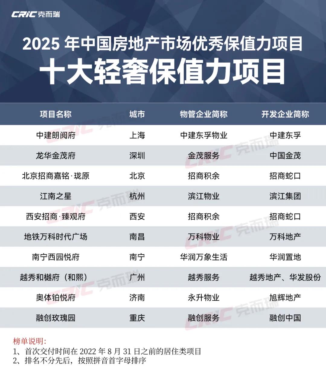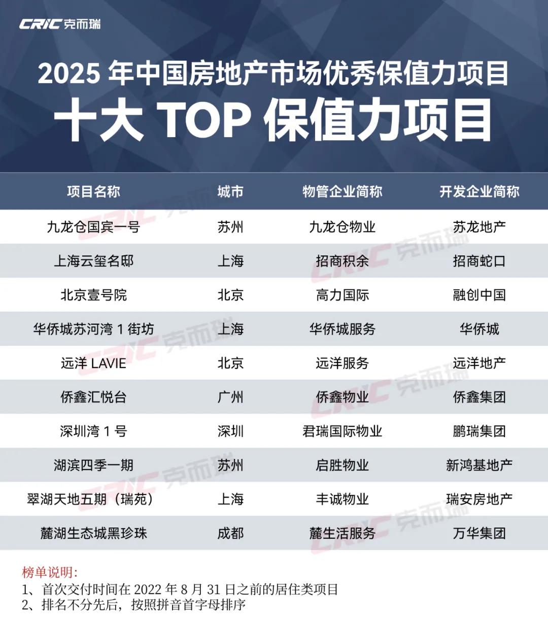 9月17日,由中国房地产业协会指导、克而瑞重磅发布『保值力』系列测评成果,涵盖2025年中国房地产保值力卓越物业企业、2025年中国房地产市场优秀保值力项目(十大TOP保值力项目、十大高端保值力项目、十大轻奢保值力项目、十大品质保值力项目、十大物服保值力项目)等。