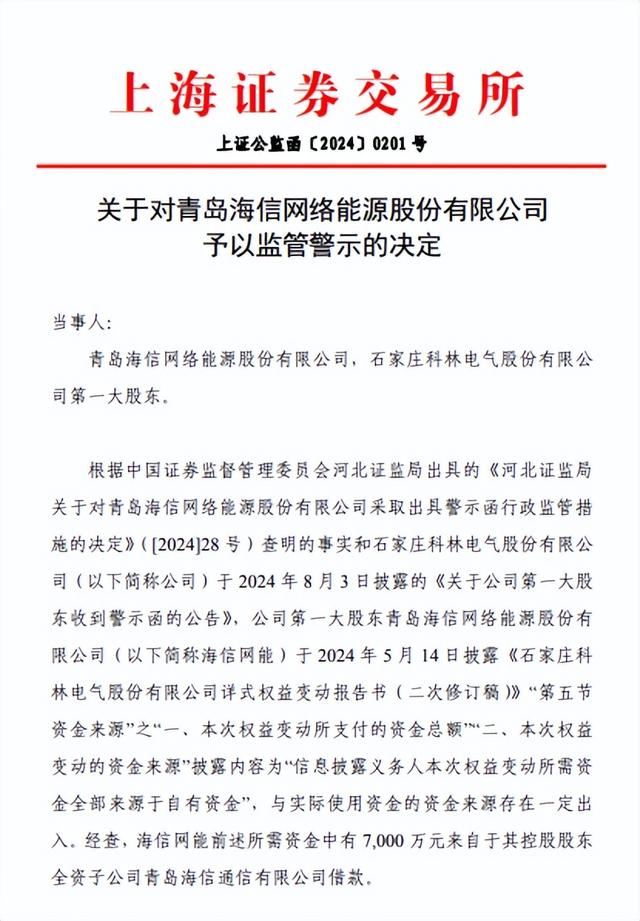 另需指出的是,在史文伯担任海信网能董事长期间,公司曾因信息披露问题被上交所采取监管警示。经河北证监局调查,海信网能在2024年披露的《石家庄科林电气股份有限公司详式权益变动报告书(二次修订稿)》中声称收购资金“全部来源于自有资金”,但实际有7000万元来源于其控股股东全资子公司青岛海信通信有限公司的借款,与公开披露内容不符。上交所据此对海信网能予以监管警示。