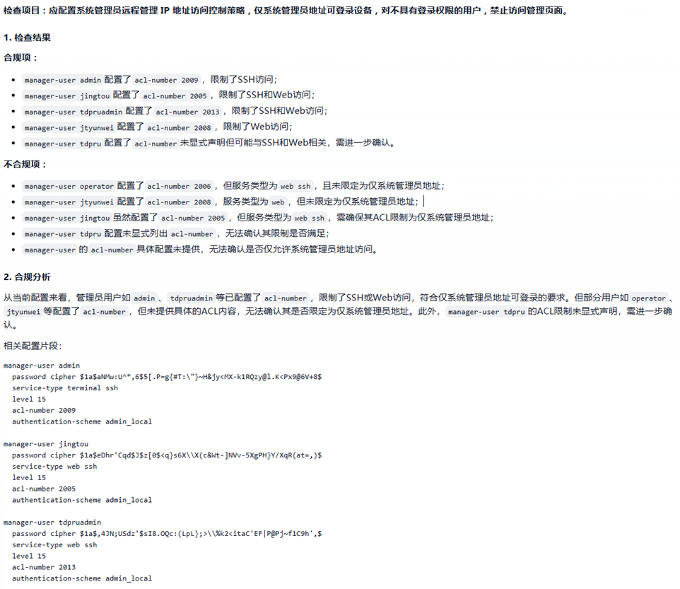 应用案例:某企业需定期对全网数百台防火墙进行等保2.0合规检查。传统方式需工程师手动登录设备,逐条核对配置,耗时耗力且易出错。部署鲁班大模型后,只需将设备配置文件输入,模型即可在分钟内自动完成全面审查: