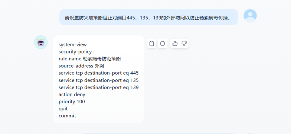 应用案例:一位新入职的安全工程师需了解“核心业务区的访问控制策略是如何设置的”。在过去,他需要请教多位老员工,并翻阅大量历史文档。现在,他只需向鲁班大模型提问:“请设置防火墙策略阻止对端口445、135、139的外部访问以防止勒索病毒传播”,模型即刻理解其意图,检索全网策略库,并用自然语言生成一份清晰、准确的摘要,包括策略条目、允许的IP/端口、对应的业务系统及负责人,并附上策略配置的原始命令行。