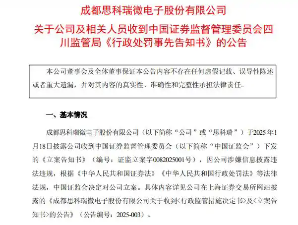 证监会针对上市公司信息披露违法违规持续加大查处力度。据不完全统计,近期就有ST思科瑞(688053)、ST创意(300366)、ST复华(600624)、科净源(301372)、国晟科技(603778)等多家上市公司分别发布公告称收到《行政处罚事先告知书》或《行政监管措施决定书》。