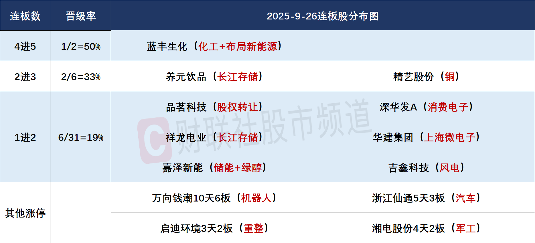 财联社9月26日讯,今日47股涨停,23股炸板,封板率为67%,蓝丰生化5连板,养元饮品、精艺股份3连板,品茗科技20cm2连板,万向钱潮10天6板,华建集团12天6板,北交所锦华新材30cm首板。市场全天震荡调整,创业板指盘中跌超2.5%。沪深两市成交额2.15万亿,较上一个交易日缩量2242亿。盘面上,市场热点较为杂乱,题材强度一般,全市场超3400只个股下跌。板块方面,风电、保险等板块涨幅居前,游戏、算力硬件、光刻机等板块跌幅居前。截至收盘,沪指跌0.65%,深成指跌1.76%,创业板指跌2.60%。