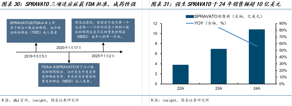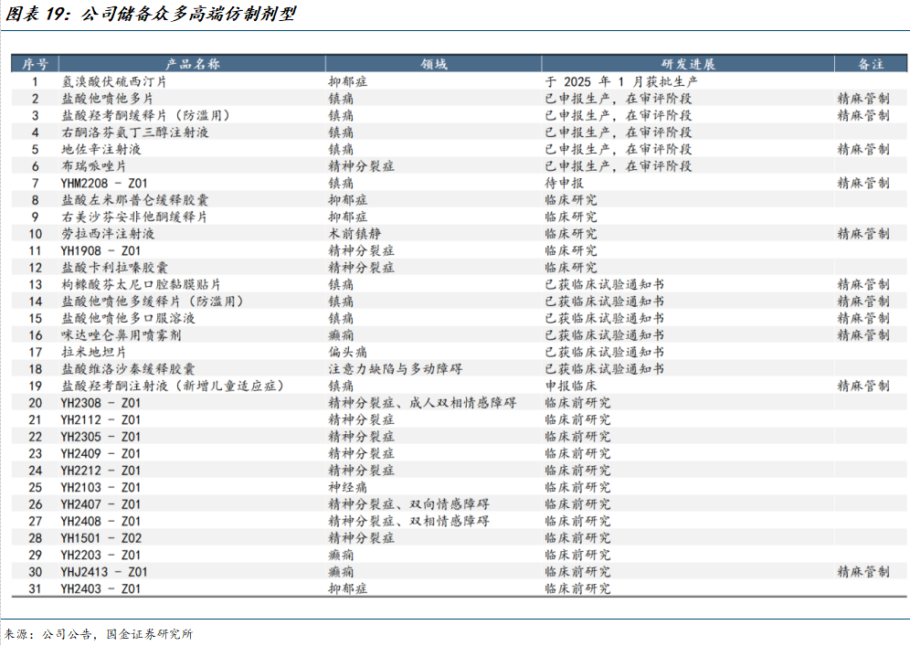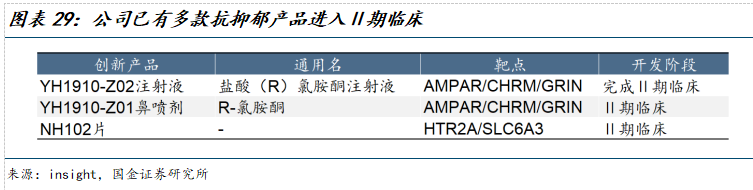 公司目前已有三款治疗抑郁症的创新药进入Ⅱ期临床,其中包括与氯胺酮相关的两款不同剂型的创新药YH1910-Z02、YH1910-Z01。海外,强生类似机制药物(SPRAVATO)已经获批上市、并取得商业化成功。