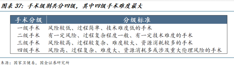 手术结构分析维度一:据2022年国家卫健委发布的《医疗机构手术分级管理办法》,该管理办法根据手术风险程度、难易程度、资源消耗程度和伦理风险,对手术进行分级、合计四个等级,其中四级手术难度最大、过程最为复杂、时间也相对更长。
