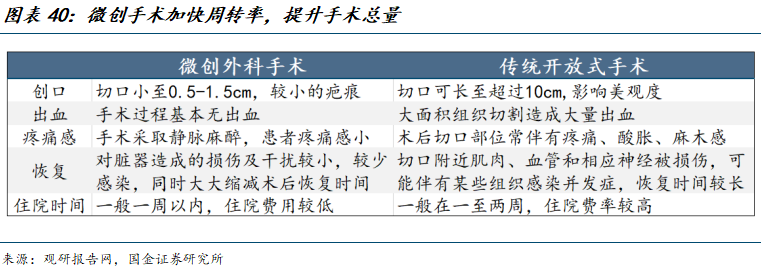 手术结构分析维度二:微创外科手术发展使外科手术周转加快,手术量提升带动麻醉药物需求增长。相较于传统开放式手术,微创外科手术创口更小、出血更少、疼痛感轻、恢复更快、住院时间更短。微创外科手术一方面对于患者来说的接受度更高,另一方面能够加快医院的手术周转效率、并提升手术总量。