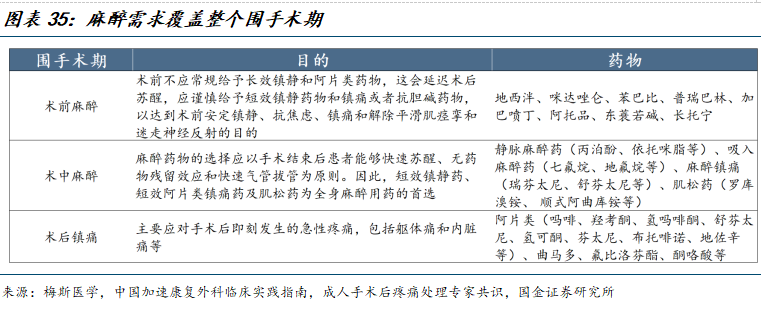 应用场景:手术室内麻醉需求涵盖整个围手术期,一般分为了:术前麻醉诱导、术中麻醉维持、术后麻醉镇痛,其中术前多涉及麻醉镇静(主要作用:催眠患者使其遗忘部分记忆),术后多涉及麻醉镇痛(主要作用:使患者不对疼痛做出反应),而术中则多为麻醉镇静和镇痛的复合用药。因此,手术作为麻醉的基础应用场景,手术量的变化紧密影响着麻醉药品的需求放量。