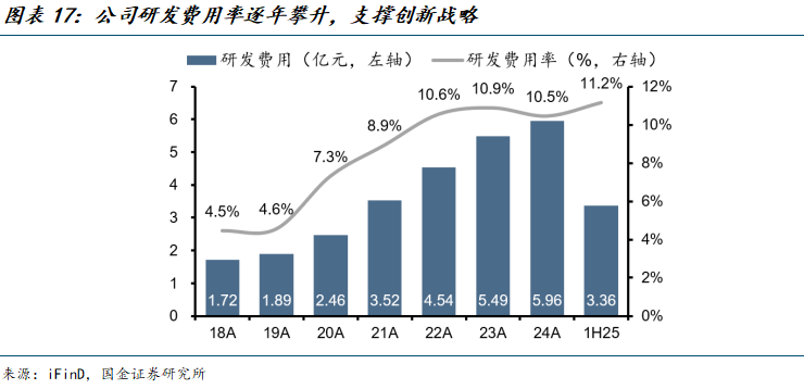 仿创结合:公司主要从事中枢神经药物的研发,实施了仿创结合的策略,不断加大对创新药物的研发投入。2025年上半年公司投入的研发费用达3.36亿元,同比增长11.36%,研发费用率维持在11.2%的高水平。截至2025年年中,强劲研发费用支撑公司在研项目达70余个,其中:在研创新药项目17余个,仿制药重点在研项目48个。