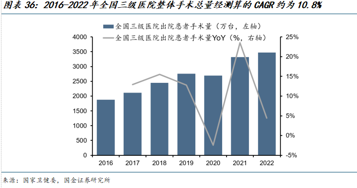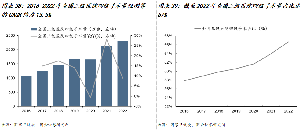 据国家卫健委数据显示,其中2016-2022年全国三级医院微创手术量经测算的CAGR约为15.7%,截至2022年全国三级医院微创手术占比达到68%。
