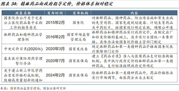 价:麻醉药品和精神药品实行政府指导价。麻醉药品和第一类精神药品仍暂时由国家有关部门实行最高出厂价格和最高零售价格管理。且自2020年5月1日起,随着新版《中央定价目录》施行,麻醉药品和第一类精神药品的定价部门由“国务院价格主管部门”修改为“国家医疗保障局”。我们认为,政府对管制类麻醉药品的指导定价管理使得管制类麻醉药品的价格体系较为稳定。