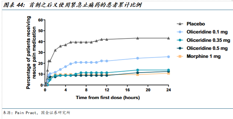 TRV-130的低剂量是减少成瘾的关键。在一项关于富马酸奥赛利定的随机、安慰剂和主动对照的Ⅲ期临床研究数据显示,0.35mg和0.5mg剂量的富马酸奥赛利定与1mg的吗啡在麻醉镇痛的有效持续性相当。因此富马酸奥赛利定能以更小的剂量实现麻醉镇痛效果,在一定程度上减少耐药性和成瘾戒断症状。