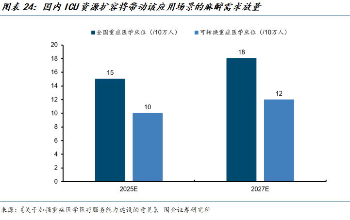 适应症拓展,覆盖目标患者人群有望实现增长:据药物临床试验登记平台显示,NH600001已经完成两项临床研究,对应适应症分别为:①麻醉诱导和短时手术麻醉;②麻醉维持、重症加强治疗(ICU)患者的镇静;而目前公司存量品种长链依托咪酯获批适应症仅为成人、6 个月以上婴幼儿、儿童和青少年的全身麻醉诱导,仅对应NH600001的①适应症。因此,未来NH600001双适应症获批,将进一步拓宽该产品覆盖的目标患者人群,尤其是打开该分子在ICU患者的镇静需求。据卫健委等多部委联合发布的《关于加强重症医学医疗服务能力建设的意见》显示,国家有关部门将重点推进重症医学医疗服务资源有效扩容。