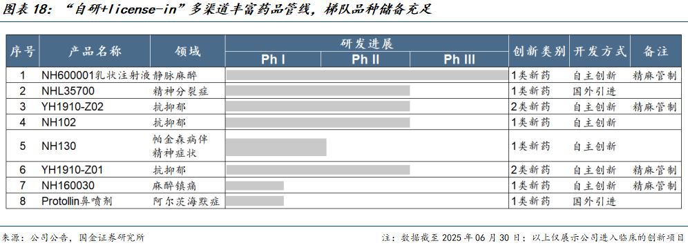 从零到一实现自研创新的重大突破。2025年8月20日据CDE官网显示,公司的NH600001以1类创新药的身份向中国药品评审中心(CDE)递交上市申请(受理编号:CXHS2500099),该药有望成为全球范围内、自2019年以来第六款获批上市的镇静新药。化药1类静脉麻醉药NH600001顺利完成Ⅲ期临床并递交上市申请,使得公司实现了自研新药从零到一的重大突破,进一步拉开了公司仿转创的新序幕。
