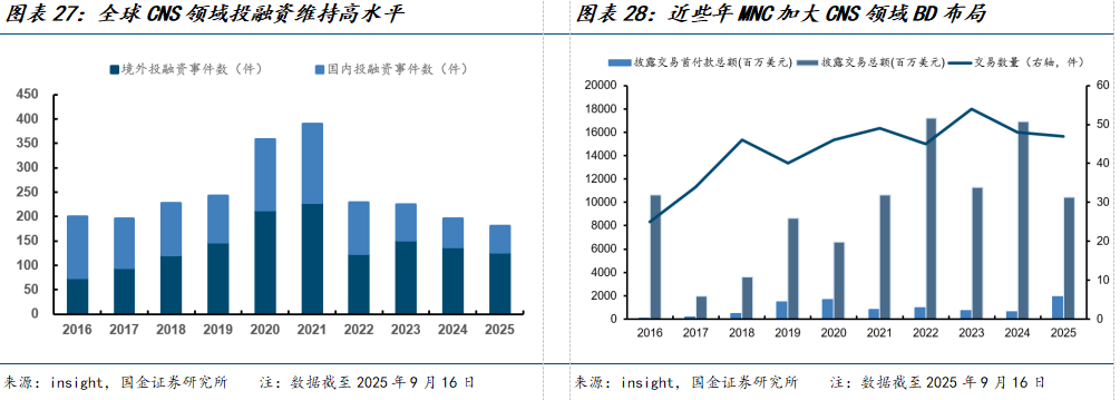在研发投入上,大量资源持续涌入CNS药物研发领域。众多大型药企(MNC),如艾伯维、百时美施贵宝、礼来等,不仅纷纷加大内部研发力度,还通过一系列高额收购、合作交易来布局CNS管线:1)2023年12月,百时美施贵宝宣布以140亿美元收购神经疾病药物公司Karuna Therapeutics(将精神分裂症新药KarXT收入囊中),该笔交易造就2023年度规模第二大的药企并购案。2)2023年,艾伯维也投入87亿美元收购Cerevel,押注CNS领域。