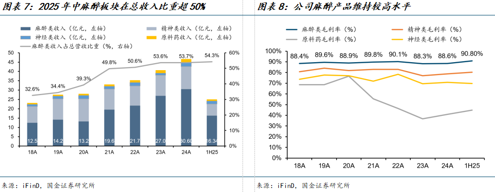 公司是国内麻醉龙头,其麻醉布局是:由麻醉镇静起家,近些年逐渐向麻醉镇痛延申布局。因此,公司麻醉管线中既有成熟的麻醉镇静药品,如咪达唑仑、依托咪酯等;又有新上市且销售增速很快的麻醉镇痛类药品,如羟考酮、瑞芬太尼、舒芬太尼以及阿芬太尼。