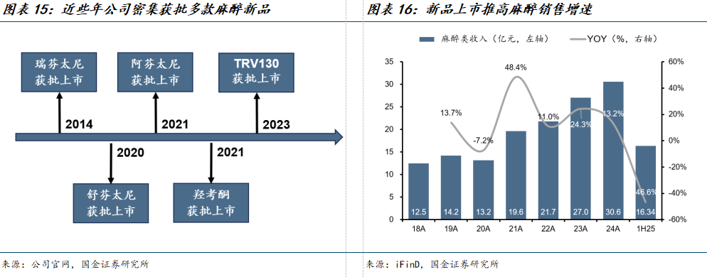 新品高增:公司近年获批的麻醉系列新品(羟考酮、瑞芬太尼、舒芬太尼、富马酸奥赛利定注射液以及阿芬太尼等)实现了快速增长,推动公司麻醉板块收入高增,即使在前几年全球公共卫生事件导致我国手术量受到扰动背景下,公司麻醉板块收入依旧保持双位数增长,2020-2024年CAGR约为23%。
