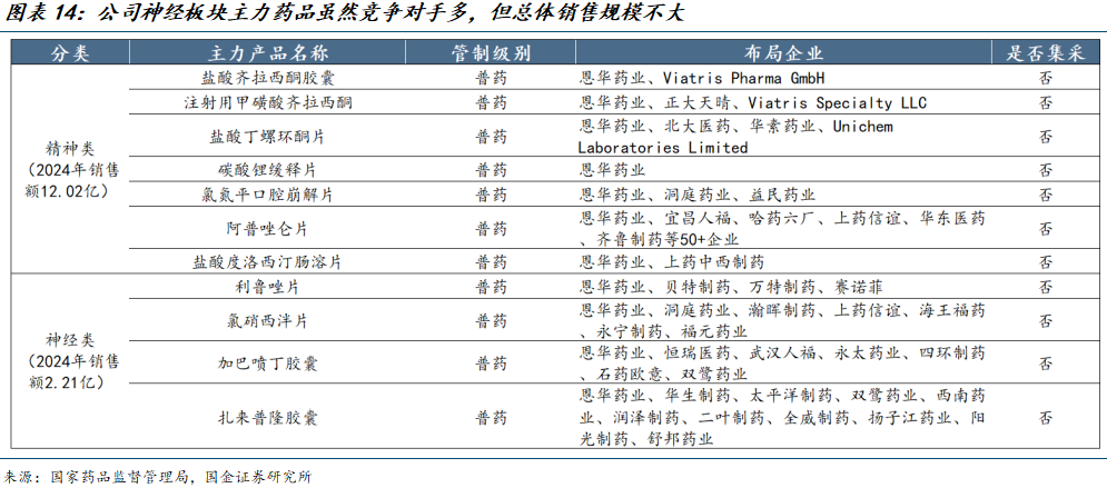 同样在公司精神和神经板块中未被集采的存量品种之间,部分药品虽然竞争对手较多,但总体销售规模有限、占比较小。我们认为,即使这类药品后续面临集采风险,但对公司的整体边际影响则相对可控。