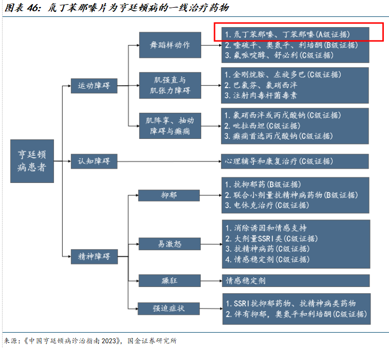 治疗格局:《中国亨廷顿病诊治指南2023》显示,丁苯那嗪是治疗舞蹈样动作的一线治疗药物(A级证据)。氘丁苯那嗪是丁苯那嗪的氘化产物,亦是治疗舞蹈样动作的一线治疗药物(A级证据),且该药的不良反应比丁苯那嗪及抗精神病类药物少。